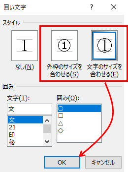 表示された設定画面でスタイルから「外枠のサイズを合わせる」「文字のサイズを合わせる」のいずれかを選んで、「OK」を選択すると、文字を〇で囲むことができます。