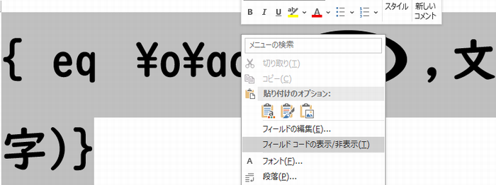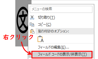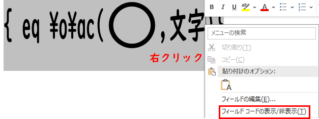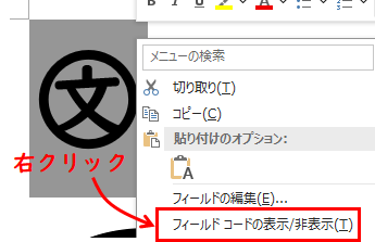 〇で囲んだ文字を選択してから、右クリック→「フィールドコードの表示/非表示」をクリックします。
