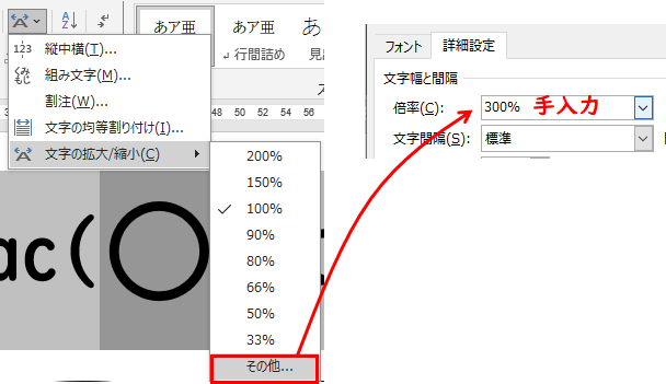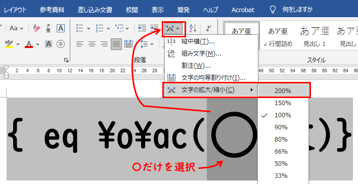 表示されたフィールドコードの中で「〇」の部分のみを選択してから、上部メニューのホーム「拡張書式」→「文字の拡大/縮小」→「200%」を選択します。