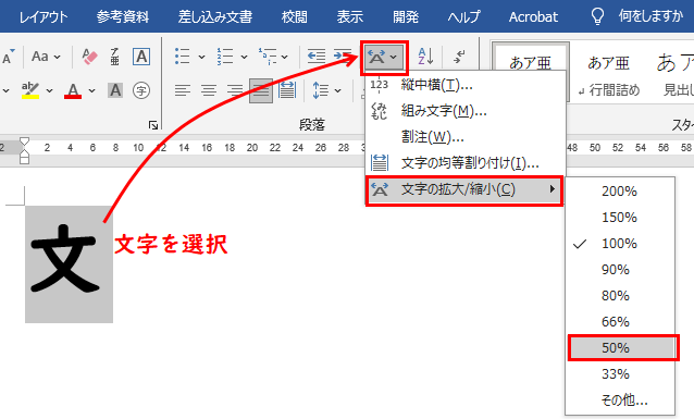 文字を選択して、上部メニューのホーム「拡張書式」→「文字の拡大/縮小」→「50%」を選択します。