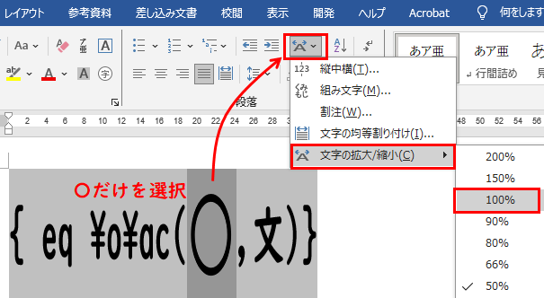 表示されたフィールドコードの中で「〇」の部分のみを選択してから、上部メニューのホーム「拡張書式」→「文字の拡大/縮小」→「100%」を選択します。